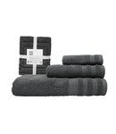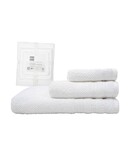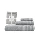 100% Cotton Set includes; 1 x washcloth (12x12" • 30x30cm) 1 x hand towel (15x25" • 38x63.5cm) 1 x bath towel (25x50" • 63.5x127cm) Available in 4 colours; White, Denim, Lt. Grey and Charcoal