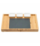 Versatile bamboo charcuterie board with a slate center, ceramic bowls, built-in cheese tool storage and a fruit tray.